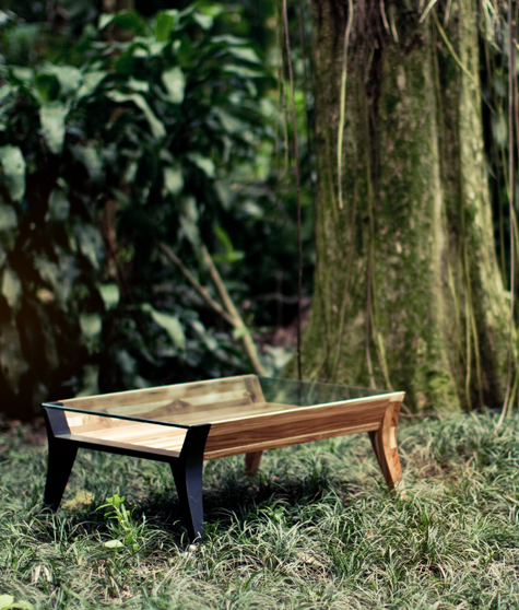 Mesa de centro que usa técnica tradicional de marcenaria, que valoriza o uso de encaixes, os materiais utilizados na fabricação dos móveis, como a madeira Teca de reflorestamento.